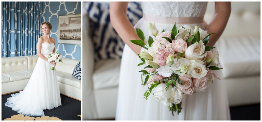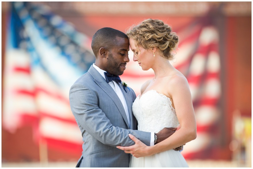 Beautiful New York City couple gets married in Philadelphia….has a nice ring to it! I can’t help the love I have for my city, so I was pretty pumped to show it off with Mollie and Peter on a beautiful summer day in a most epic location. From Mollie getting ready at the gorgeous Kimpton Hotel Monaco, to Peter and his guys living large at their own bright loft for day of preparations, to the sweeping views of the Ben Franklin Bridge on the Race Street Pier… this day was incredible. We ventured around Old City and the Delaware waterfront, past fences and through fields to get some patriotic summer lovin’ looks. I had always wanted to photograph the American Flag mural that is displayed an abandoned warehouse on Colombus Blvd., but because it’s large size, it was hard to figure out how to get the right perspective. On my location scouting bike ride the week before, I found it – an unassuming whispy, field of tall grasses next to a storage garage parking lot. A bit unconventional to say the least, but Mollie and Peter didn’t even flinch when I told them my plan. She picked up her dressed and march straight into unknown territory with me, and the results were amazing!